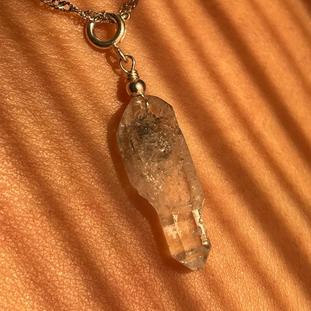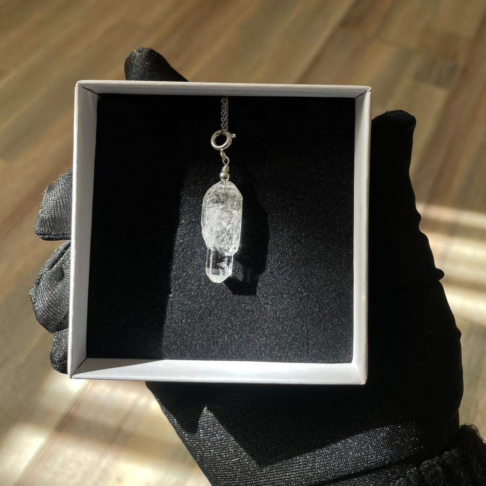 - قلادة من حجر الماس هيركمر الطبيعي النادر و هذا الحجر يسمى بشبية الالماس لندرته غالبًا ما ترتبط ماسات هيركيمير بخصائص ميتافيزيقية قوية. يعتقد العديد من عشاق الكريستال أن بلورات الكوارتز ذات النهاية المزدوجة هذه تمتلك طاقة اهتزازية عالية يمكنها تعزيز التأمل والنمو الروحي والشفاء بالطاقة. يُعتقد أن وضوح هذه البلورات يعزز التفكير الواضح والتوازن العاطفي، بينما يُعتقد أن بنيتها ذات النهاية المزدوجة تسهل تدفق الطاقة في كلا الاتجاهين، مما يجعلها فعالة في إزالة الانسدادات الطاقية وتضخيم النوايا.