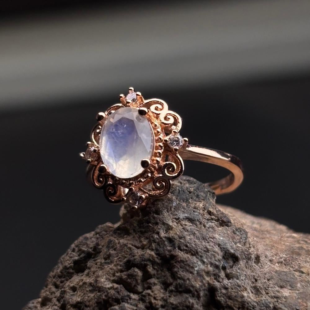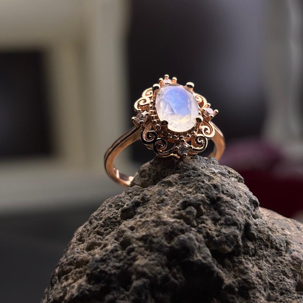 - الخاتم سيأخذك إلى عالم الأميرات، حيث يلتفّ حجر القمر بحلقاتٍ متقاطعة من الروز جولد المزخرف بتفاصيل دقيقة، كأنه تاجٌ صغيرٌ يزيّن الجوهرة. هذا التصميم الكلاسيكي الأنيق يجعله قطعةً خالدةً لا تذهب موضتها، ويناسبُ كل مناسباتكِ، من اللقاءات اليومية إلى السهرات الفاخرة.