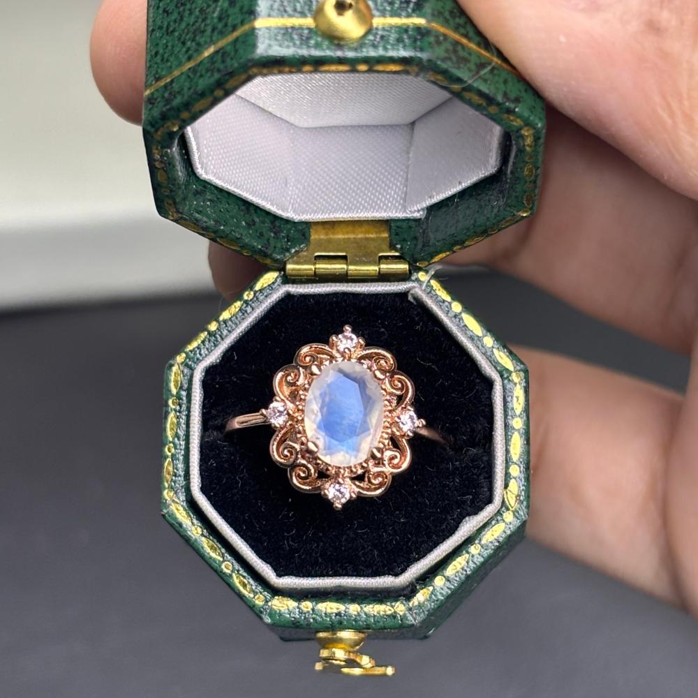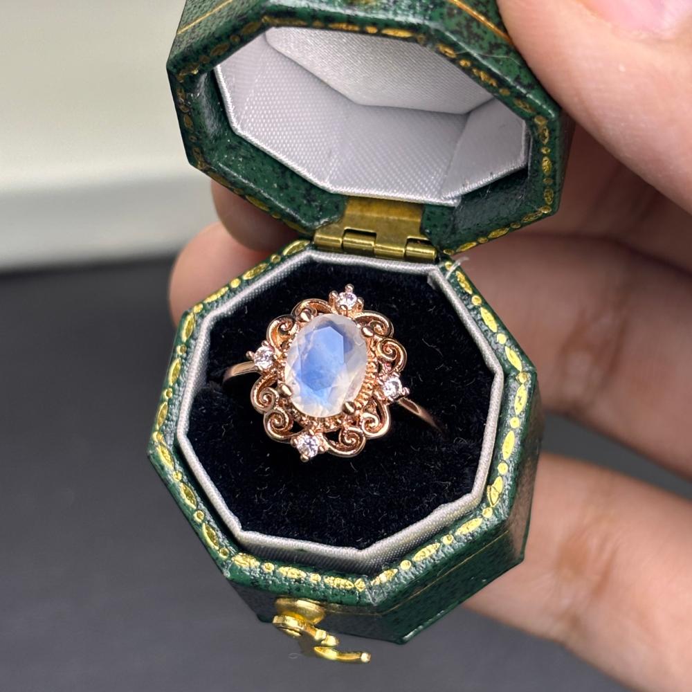 في قلب هذا الخاتم، تتلألأ جوهرةٌ ساحرةٌ من حجر القمر الطبيعي، بقطعٍ بيضويٍّ يجسّد الأنوثة والنعومة. هذا الحجر يشتهر بتوهجه اللبني الذي يذكّر بضوء القمر الهادئ، يتراقصُ عليه انعكاسٌ أزرقٌ خفيف مع كل حركة، فيبدو كأنه يحملُ سرًّا من أسرار الليل.